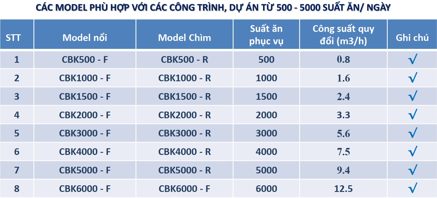 Bảng quy đổi Công suất và lựa chọn Model bể tách mỡ tự động cho dự án