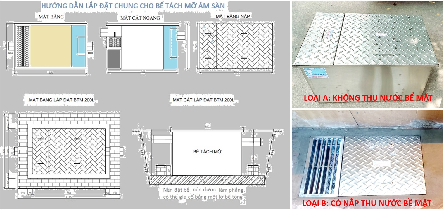 Bể tách mỡ công nghiệp 200 lít, 300 lít, 500 lít, 1000 lít, cấu tạo và bản vẽ lắp đặt