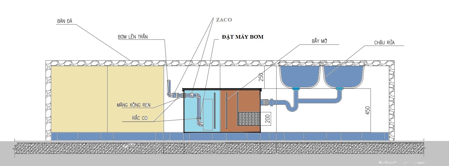 - Vị trí lắpđặt: Bể tách mỡ gia đình, thùng lọc mỡ công nghiệp, được đặt dưới chậu rửa chén hoặc âm dưới đất kết nối đầu vào với bồn rửa và đầu ra với đường ống nước thải công cộng hoặc cống rãnh phù hợp với điều kiện thoát nước của từng dự án
