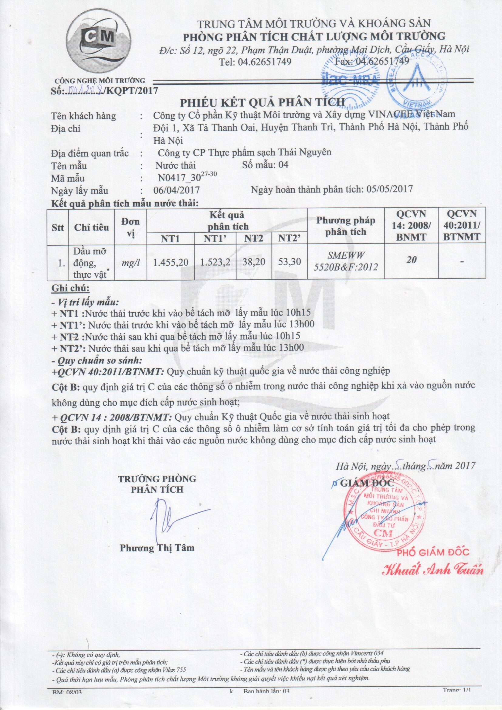 Sản phẩm được nghiên cứu thiết kế và chế tạo bởi Công ty CP Kỹ thuật Môi trường và Xây dựng VINACEE Việt Nam. (kiểm tra loại bỏ >90% lượng dầu mỡ)
