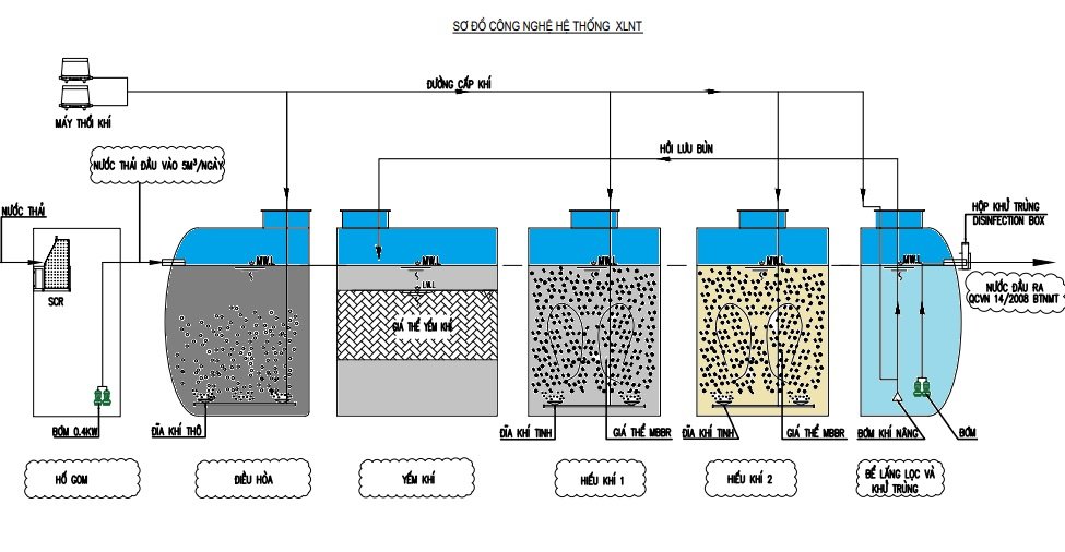 Bể MBBR: nước thải sau khi ra khỏi bể điều hòa được dẫn qua bể xử lý sinh học hiếu khí với công nghệ MBBR kết hợp giữa quá trình màng sinh học và quá trình bùn hoạt tính.