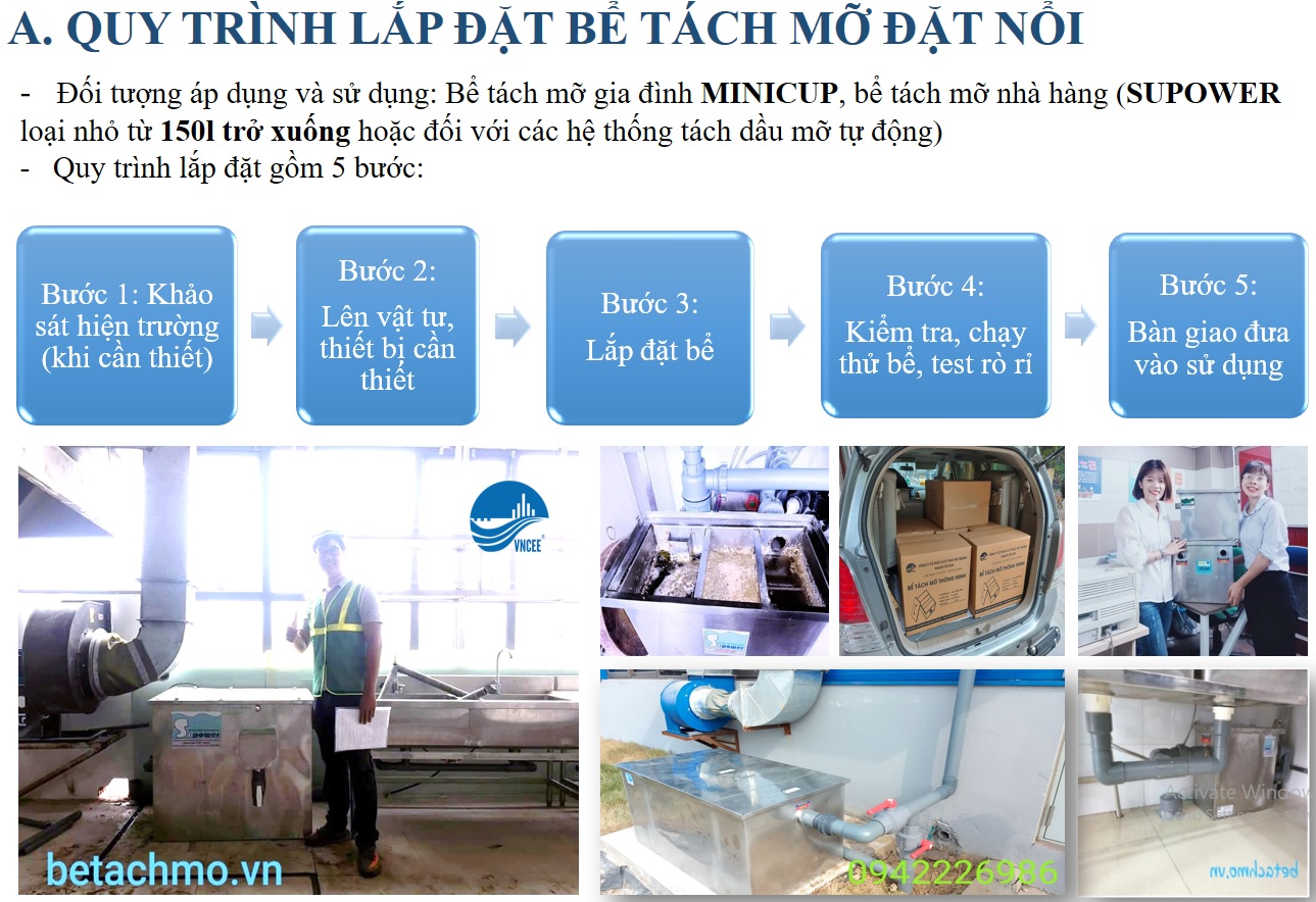 Một bước quan trọng trong việc xử lý nước thải sinh hoạt hay công nghiệp để vừa tiết kiệm chi phí xử lý sự cố môi trường, nhân lực đó là lắp đặt thiết bị tách dầu mỡ trên hệ thống thoát nước trước khi nước được thoát vào hệ thống chung. Vậy, lắp bể tách mỡ như thế nào là đúng quy cách, phù hợp với các công trình, dự án, hãy xem chi tiết qua tài liệu hướng dẫn lắp đặt bể tách mỡ do các KS Môi trường tại VINACEE tổng hợp.