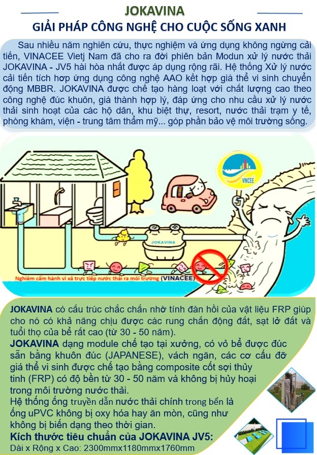 Xử lý nước thải bằng Module chế tạo sẵn băng Composite (FRP) là sản phẩm đang thịnh hành và là xu hướng phổ biến ngày nay bới những sự tiện dụng và lợi ích mang lại. Module xử lý nước thải được dứng dụng nhiều trong xử lý nước thải sinh hoạt, khu dân cư, xử lý nước thải y tế, bệnh viện, trường học. VINACEE Việt Nam xin được giới thiệu với Quý đối tác tài liệu chi tiết Module JIKAVINA - JV5, đang được ứng dụng cho nhiều công trình, mang lại hiệu quả bảo vệ môi trường vô cùng lớn.