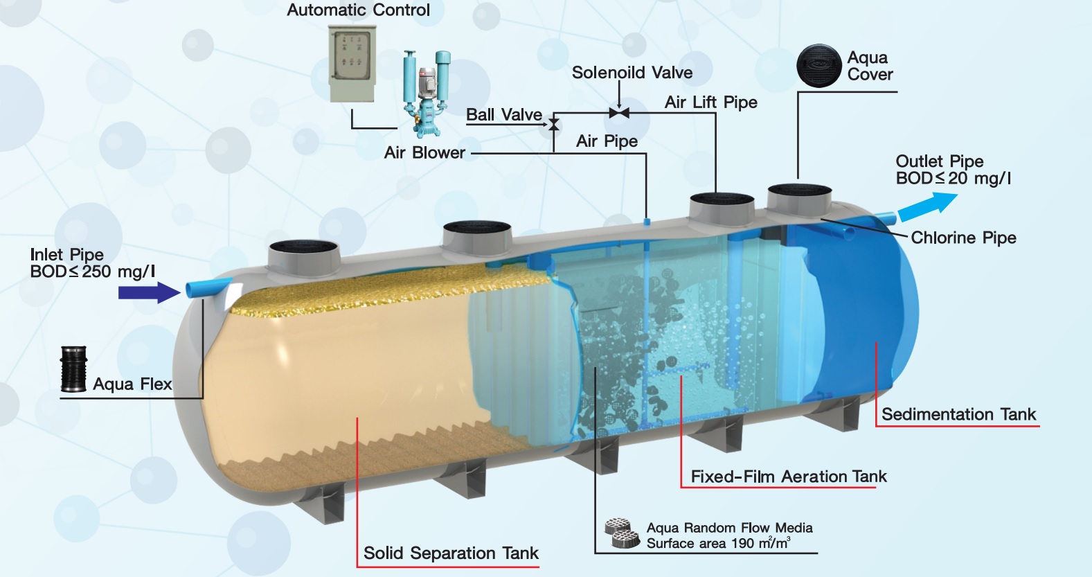 Bồn xử lý nước thải Composite là một hệ thống gồm nhiều ngăn nhỏ ở trong, mỗi ngăn có một chức năng khác nhau. Trng bồn xử lý nước thải được cấu thành từ 5 ngăn nhỏ, cụ thể :