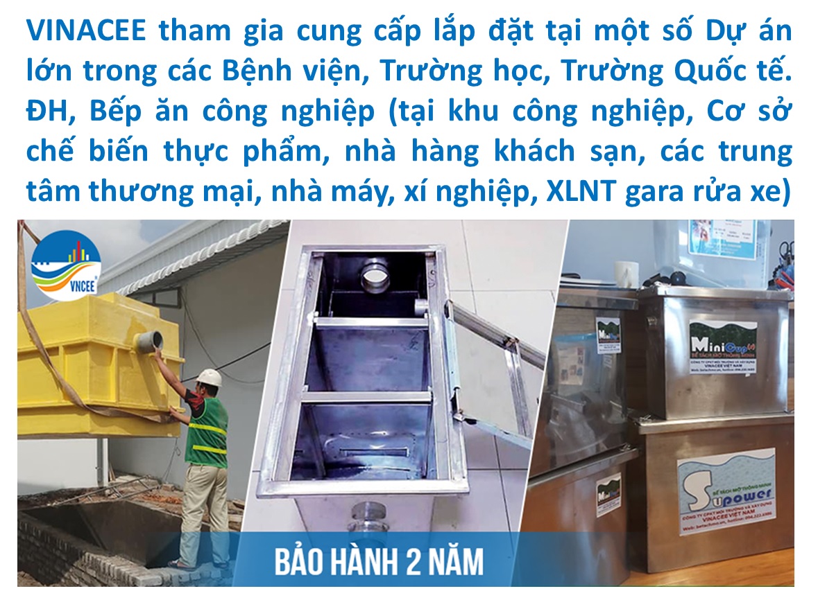 Tại Việt Nam, VINACEE (Hệ thống xử lý nước thải Gara chăm sóc xe) luôn tự hào là đơn vị số một về thiết kế, chế tạo, sản xuất cung cấp các thiết bị tách dầu mỡ với hàng trăm dự án cho các đối tác trong và ngoài nước.
