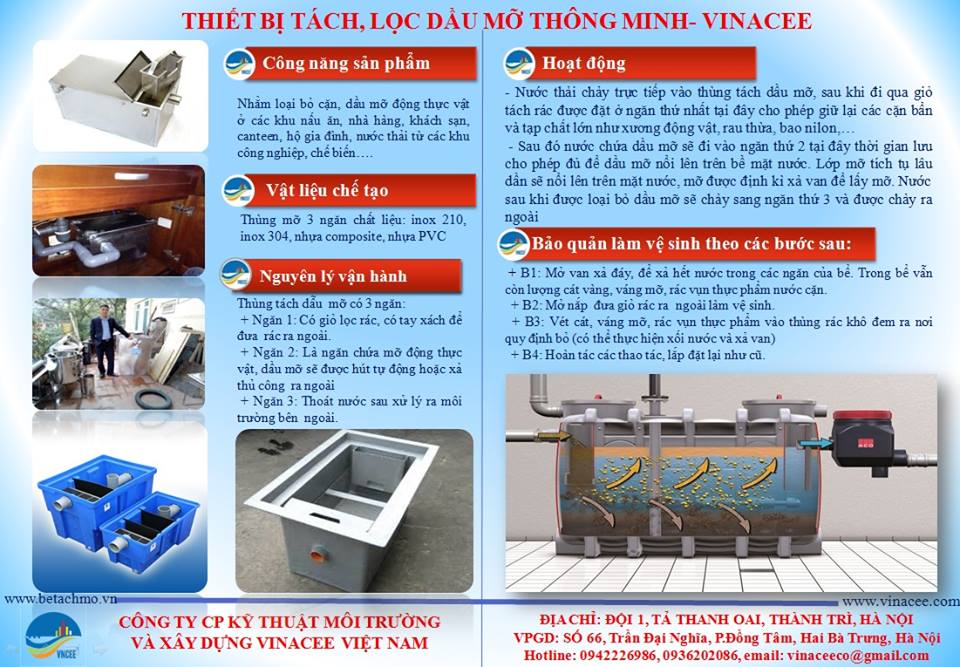 Công ty CP Kỹ thuật Môi trường và Xây dựng VINACEE Việt Nam sẽ tư vấn và cung cấp cho công trình của bạn công nghệ mới nhất về xử lý nước thải trong nhà bếp dựa trên nguyên lý tuyển trọng lực, đó là công nghệ tách mỡ. Mỡ hình thành trong suốt quá trình xả nước thải của các nhà hàng, khách sạn, các trung tâm ăn uống lớn….