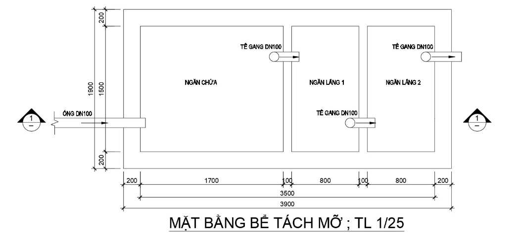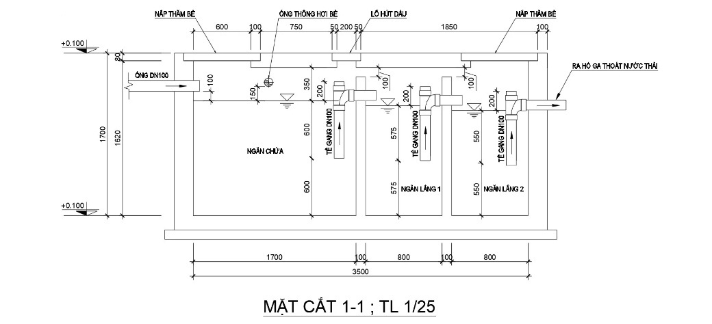 Mặt cắt của bể tách mỡ được thể hiện chi tiết theo hình