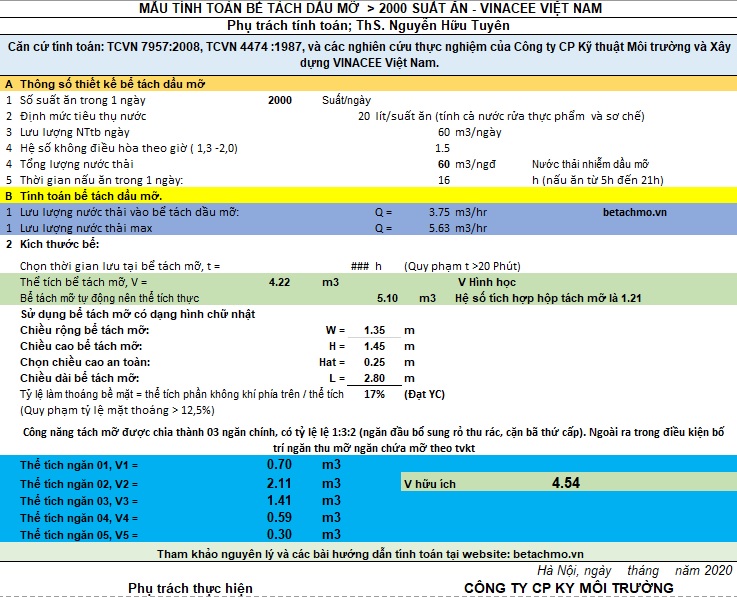 Mẫu tính toán thiết kế hệ thống tách dầu mỡ công nghiệp ? 2000 suất ăn