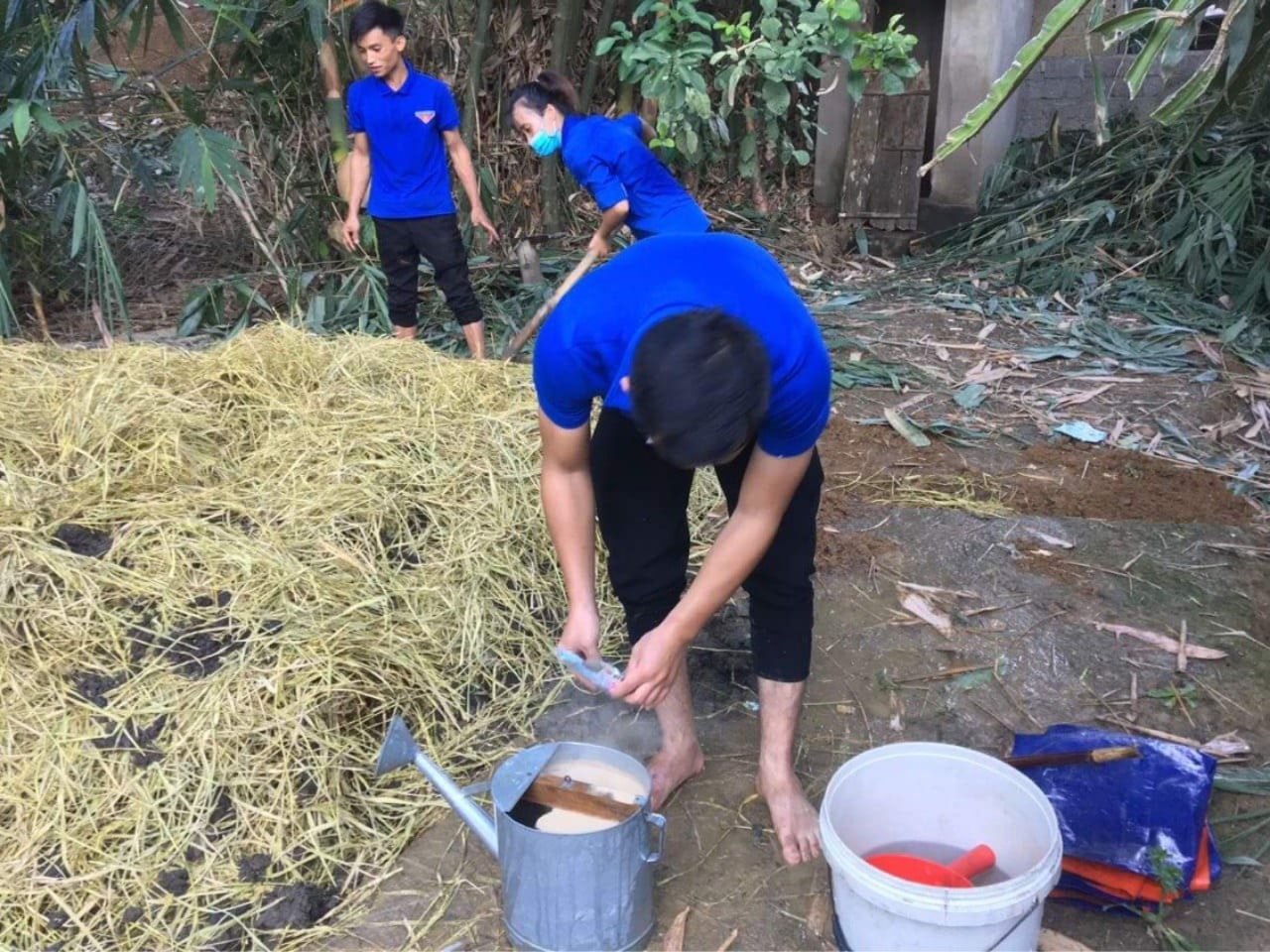 -Hòa 2 gói chế phẩm vi sinh xử lý chất thải hữu cơ EMIC 200gr vào 5 - 10 lít nước sạch, tưới đều lên nguyên liệu ủ và đậy kín.