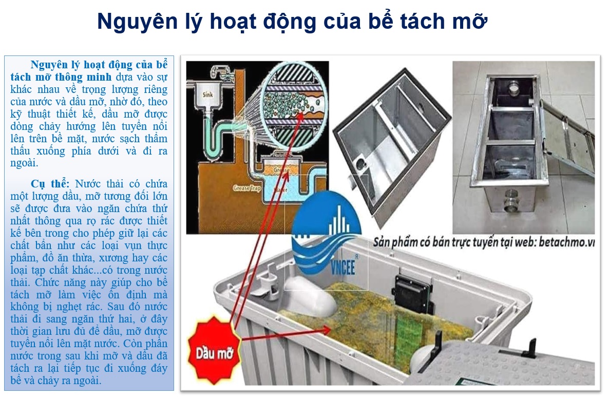 Nguyên lý hoạt động của bể tách mỡ thông minh dựa vào sự khác nhau về trọng lượng riêng của nước và dầu mỡ, mỡ nhẹ hơn nước nhờ đó, theo kỹ thuật thiết kế tối ưu của các KSMT, dầu mỡ được dòng chảy hướng lên tuyển nổi lên trên bề mặt, nước sạch thẩm thấu xuống phía dưới và đi ra ngoài (hiệu quả loại bỏ dầu mỡ có thể đặt tới 98%).