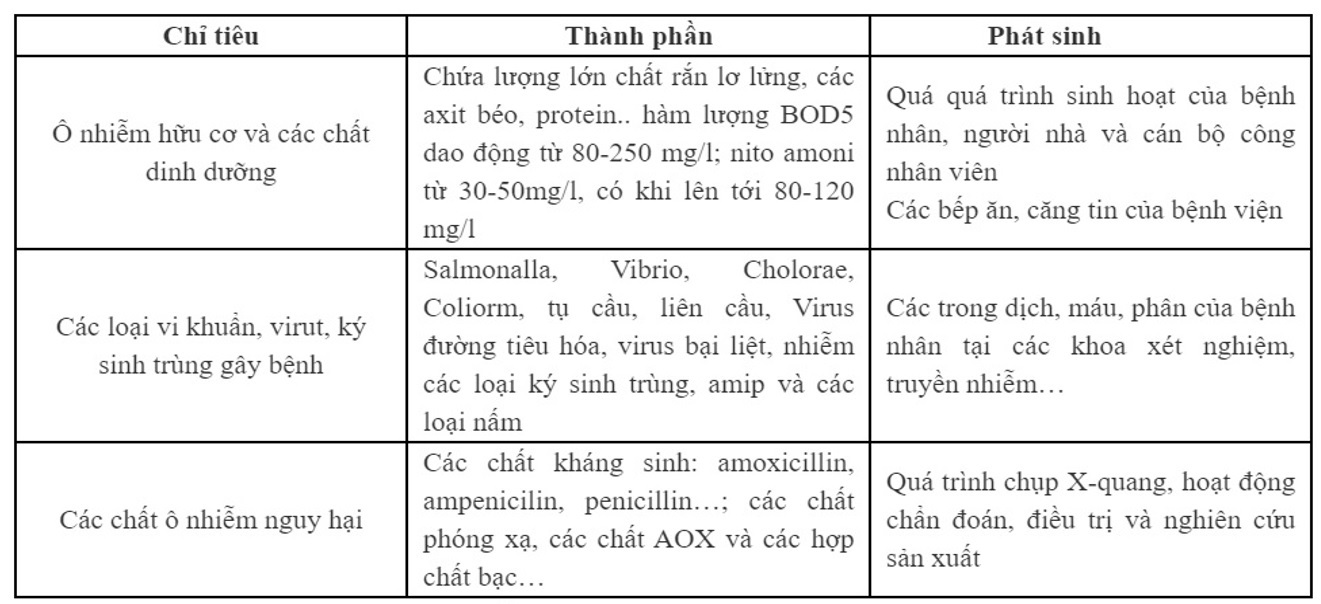 Nước thải y tế có thành phần đa dạng bao gồm: nước thải sinh hoạt của cán bộ công nhân viên, bệnh nhân, người nhà bệnh nhân; của các bếp ăn, căng tin… Bên cạnh đó, hóa chất từ quá trình khám và điều trị bênh nhân như: các chế phẩm thuốc, các chất khử trùng,.. từ các khu xét nghiệm, phòng mổ cũng dễ dàng bị nhiễm vào nguồn nước thải do quá trình vệ sinh cá nhân hoặc các dụng cụ y tế hoặc có thể theo nước mưa.