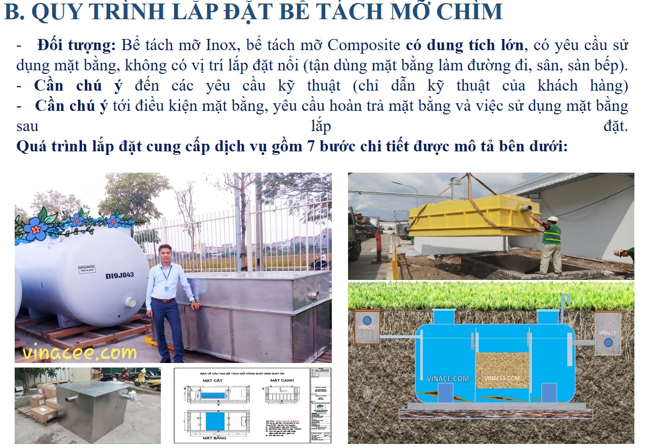 Sau đây VINACEE xin giới thiệu cùng bạn đọc trọn bộ tài liệu hướng dẫn lắp đặt bể tách mỡ đầy đủ nhất, thực tiễn nhất từ các hoạt động cung cấp dịch vụ của VINACEE Việt Nam XEM THÊM BẢN VẼ LẮP ĐẶT