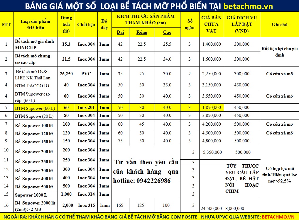 Một số thông số kỹ thuật cơ bản tham khảo và bảng giá của bể tách mỡ