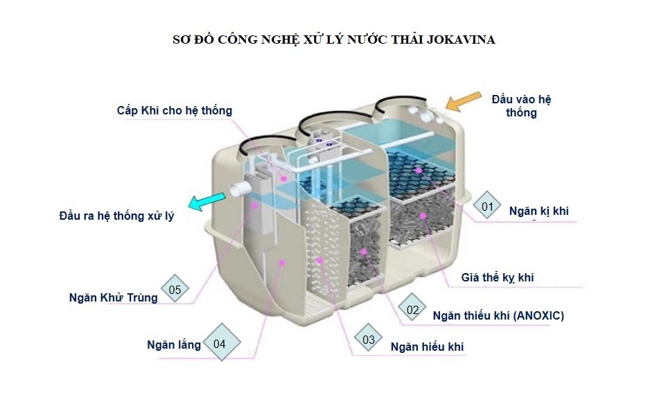 - Jokavina có vỏ bể được đúc sẵn bằng khuôn (Japanese); Vách ngăn, các cơ cấu đỡ giá thể vi sinh được chế tạo bằng composite, cốt sợi thủy tinh, không bị hư hại trong môi trường xử lý nước thải.