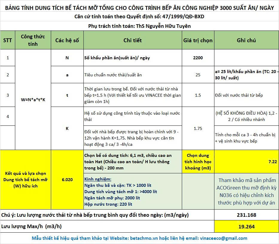 Tính toán lựa chọn bể tách mỡ công nghiệp ACO Green theo QCVN và HD của VINACEE
