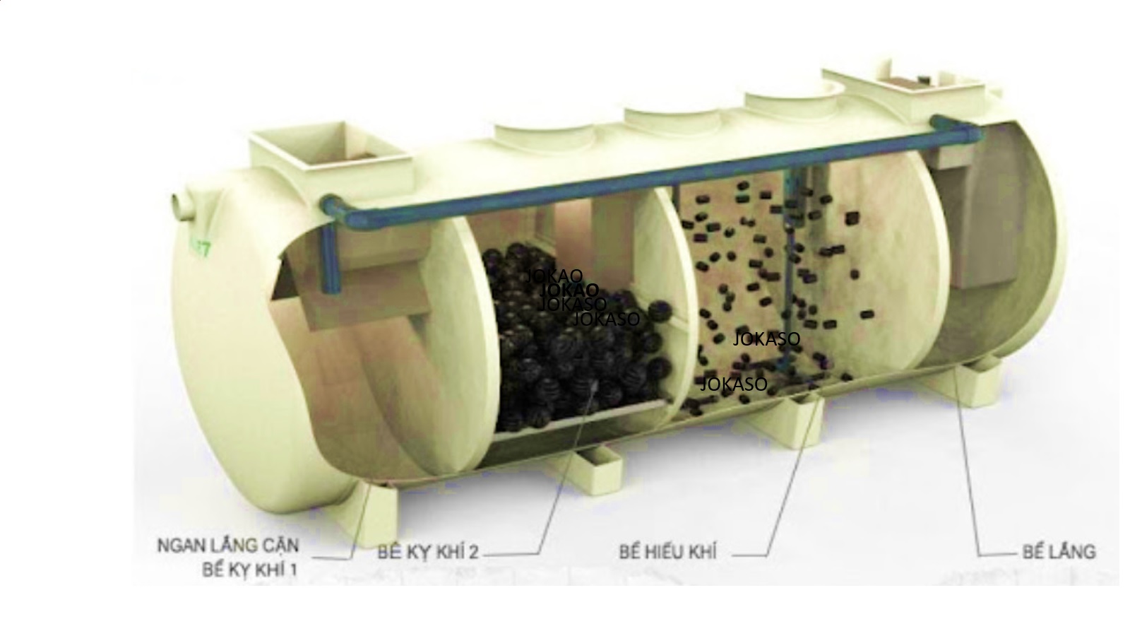 Ngăn xử lý hiếu khí: Jokasou sẽ thực hiện quá trình khử BOD, nito, photpho theo phương pháp sinh học có sự xuất hiện của các vi sinh vật hiếu khí.