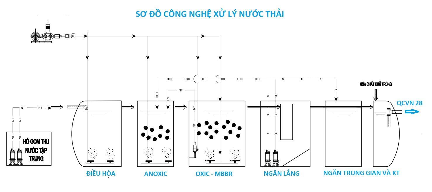 Sơ đồ công nghệ phố biết nhất à AO hoặc AAO kết hợp với giá thể vi sinh chuyển động MBBR, ngoài ra một số trường hợp đặc biệt hơn có thể kết hợp công nghệ màng MBR trong bể sinh học hiếu khí (Oxic)