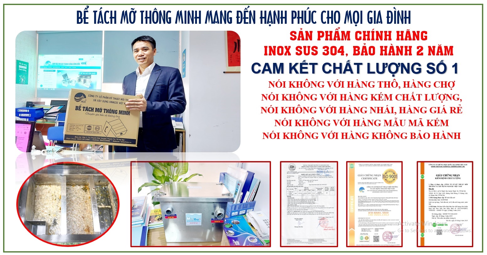 Bên cạnh đó, thiết bị của VINACEE được sản xuất trên các thiết bị máy công nghiệp, mang đến sản phẩm có mẫu mã, chất lượng được kiểm tra đánh giá quy trình quản lý chứng nhận theo tiêu chuẩn ISO 9001. 2015 cùng với đó là chính sách hậu mãi lâu dài với chế độ bảo hành từ 2 năm (đối với bể tách mỡ gia đình) đến 5 năm (đối với thiết bị tách mỡ công nghiệp).