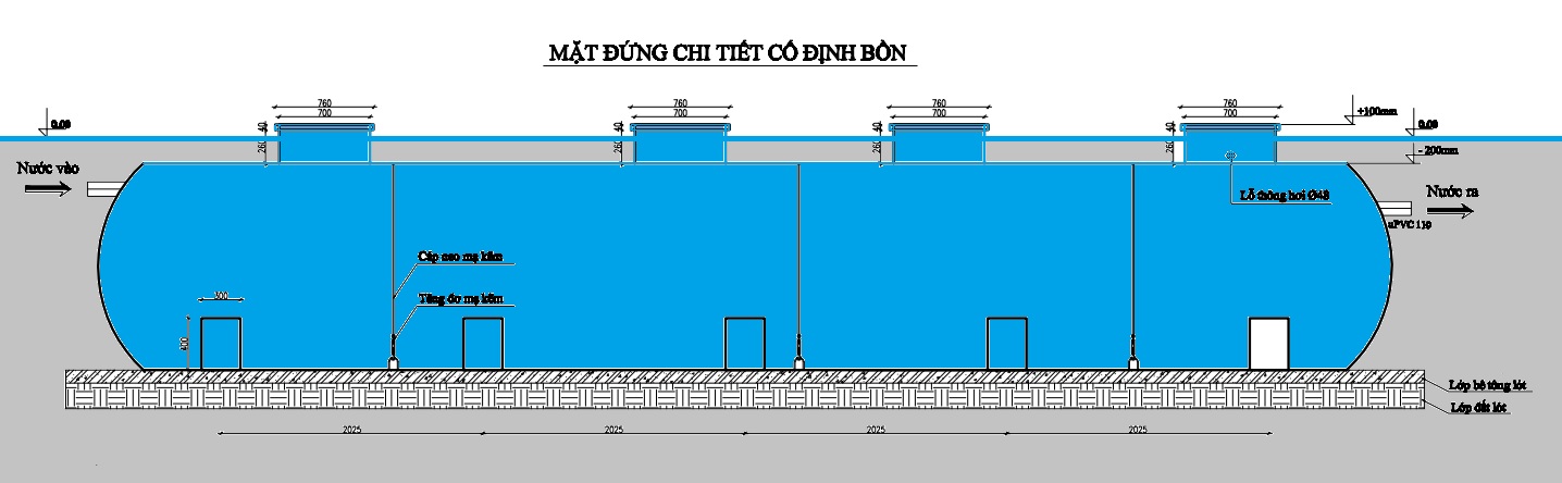 + Căn chỉnh bể, và tích nước đủ, khu vực có mực nước ngầm cao cần bổ sung biện pháp neo cố định bể chống nổi